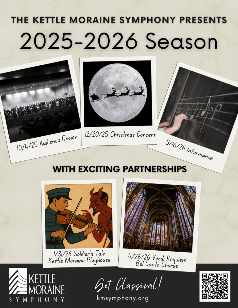 February’s collaboration with the Kettle Moraine Playhouse will bring Stravinsky’s Faustian A Soldier’s Tale to life, and in April, KMS will collaborate with four outstanding soloists, the Bel Canto Chorus, and several high school choruses to perform Verdi’s transcendent Messa da Requiem.